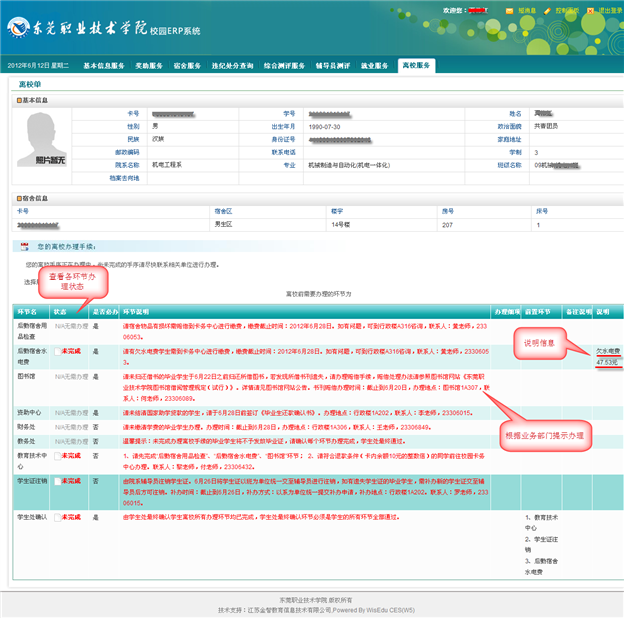 1、各位同学登录东莞职业技术学院校园ERP系统后,点击离校服务进入离校管理开始查询各办理环节的状态,各位同学查询到的环节状态显示未完成或未通过的,请在规定时间内前往指定地点进行现场办理。