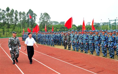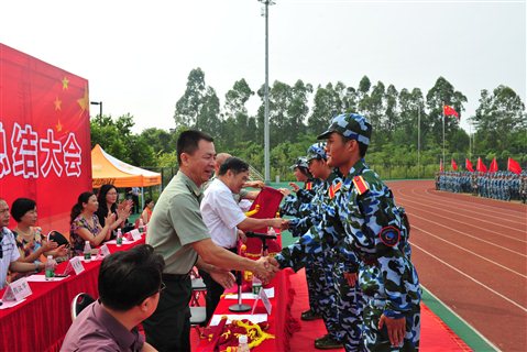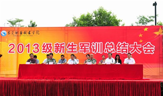 9月28日上午,2013级新生军训总结大会在我院田径场隆重举行。东莞军分区副参谋长周克冠上校、东莞市国防教育训练基地主任林冬生、学院党委副书记莫强、学院副院长李奎山教授等领导出席大会,教务处、学生处、保卫处及各系负责人,全体辅导员,新生班主任和全体新生,全体教官参加大会。大会由林冬生同志主持。