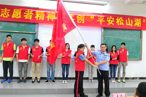 活动开始,由松山湖公安分局巡警大队教导员张兴国同志为志愿者授旗,志愿者代表志愿服务中心副主任陈超同学上台接旗,并由志愿者代表11级电子工程系电气1班刘盛康同学代表发言。志愿者郑重承诺为维护校园安全,贡献自己的一份力量。