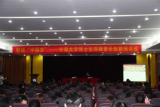 4月25日晚,我院在行政楼B201举办了“解读‘中国梦’”专题讲座,主讲专家为中南大学政治学院博士生导师曾长秋教授。讲座由学生处负责人余忠信老师主持。思政部负责人郑继海副教授、院团委书记王博博士、学生处和各系辅导员老师及各系各班学生代表300多人参加了本次讲座。