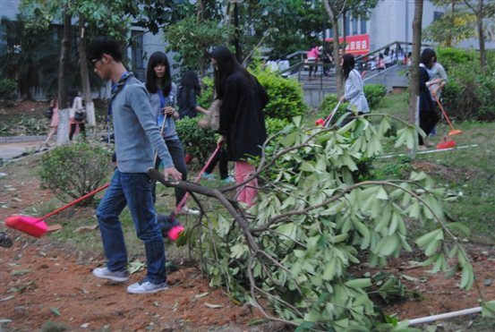 “看到学院受灾后的情况,我们感到很痛心,作为东职的一分子,我们觉得有义务为学院做点什么,于是就从宿舍里拿来扫把工具来清理下,略尽自己的微薄之力!”一位同学感叹道。
