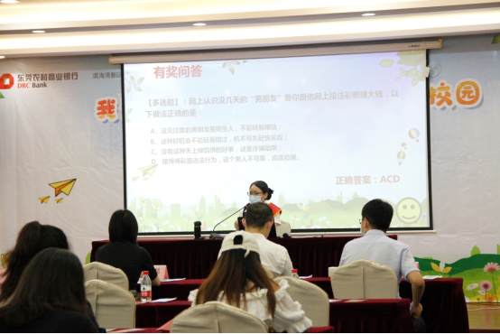 主讲人徐雪娜分别从认识“校园贷”深渊,守住“钱袋子”、防范电信网络诈骗,保障财产安全、普及存款保险知识三个方面用案例分析和视频展示等形式向大家介绍了如何防范校园贷风险、牢记“五要”;如何防金融诈骗的相关知识,谨记“三不一要”;防范“电信网络诈骗”的“十个凡是”小秘诀。同学们积极参与,现场气氛热烈。
