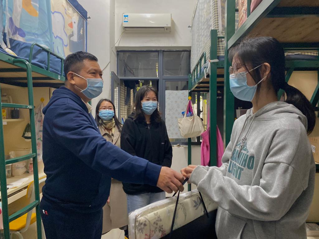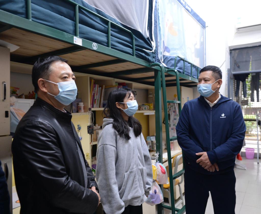 每到一间宿舍,朱益民书记都温情地问候同学:“你们从哪里来?”“寒假回家的车票好不好买?”“假期打算怎么过?”。同学们表示车票已经买好了,并主动向朱书记分享在学校学习、生活的情况。朱书记关切地慰问来自新疆的同学:“家乡的疫情防控要求了解吗?”“生活上、学习上有没有困难?”“有什么问题需要学校帮忙解决的吗?”……同时,他鼓励同学们认真学习,多看书,并为有需要的同学送上御寒物品。随后,朱益民书记也叮嘱同学们在疫情期间要加强自我安全防护意识,做好防疫措施,配合好学校各项疫情防控措施,共同筑牢学校疫情防控网。最后,朱益民书记一行还巡察了学生宿舍周边的环境,详细了解学生宿舍目前的情况。