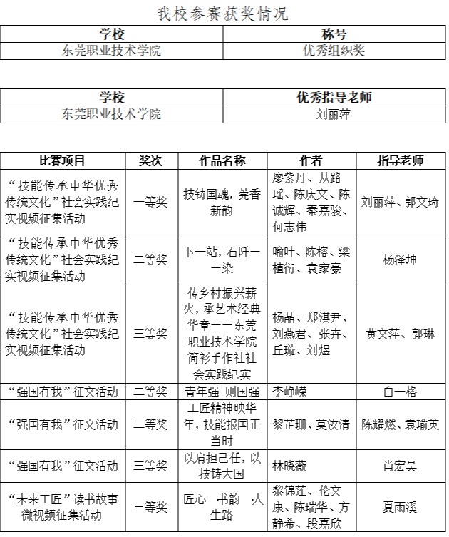 1月20日,广东省教育厅公布了 2024年职业院校“技能成才 强国有我”系列教育活动结果,我校成功从众多参赛院校中脱颖而出,荣获最佳组织奖。我校师生在活动中获得一等奖1项、二等奖3项、三等奖3项以及优秀指导老师奖1项的历史最佳成绩。