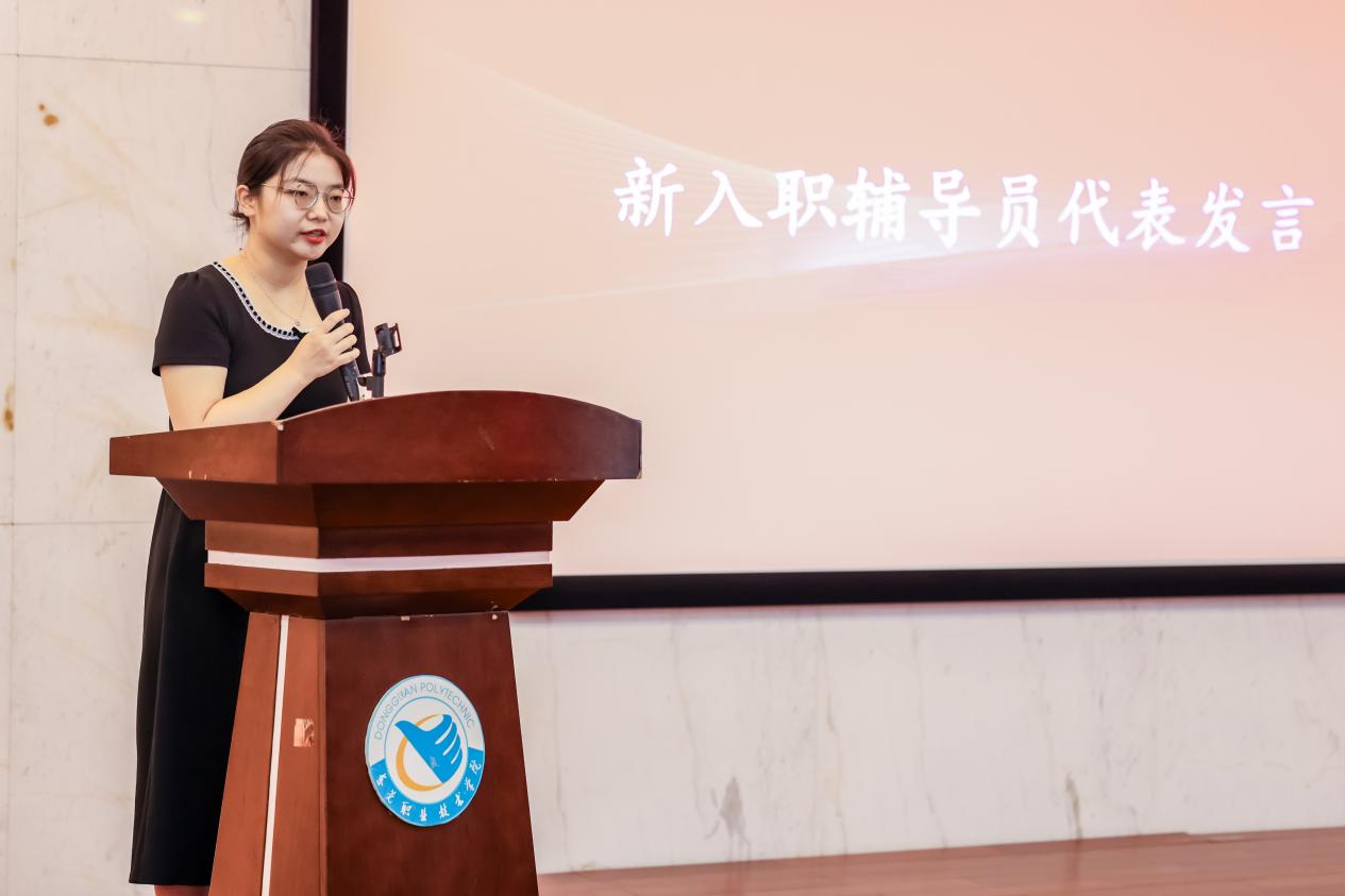 随后是简单而庄重的"师徒结对"环节,9名新入职辅导员和各自的成长导师一一结对并献花。成长导师代表梁欢在发言中表示,将不辜负学校的信任,认真履行好成长导师的职责,携手新入职辅导员做青春路上永远年轻的点灯人。新入职辅导员代表徐俊表示,非常荣幸加入东职学工的大家庭,并将在辅导员岗位上履职尽责,做好学生思想的引路人和学生生活的贴心人。