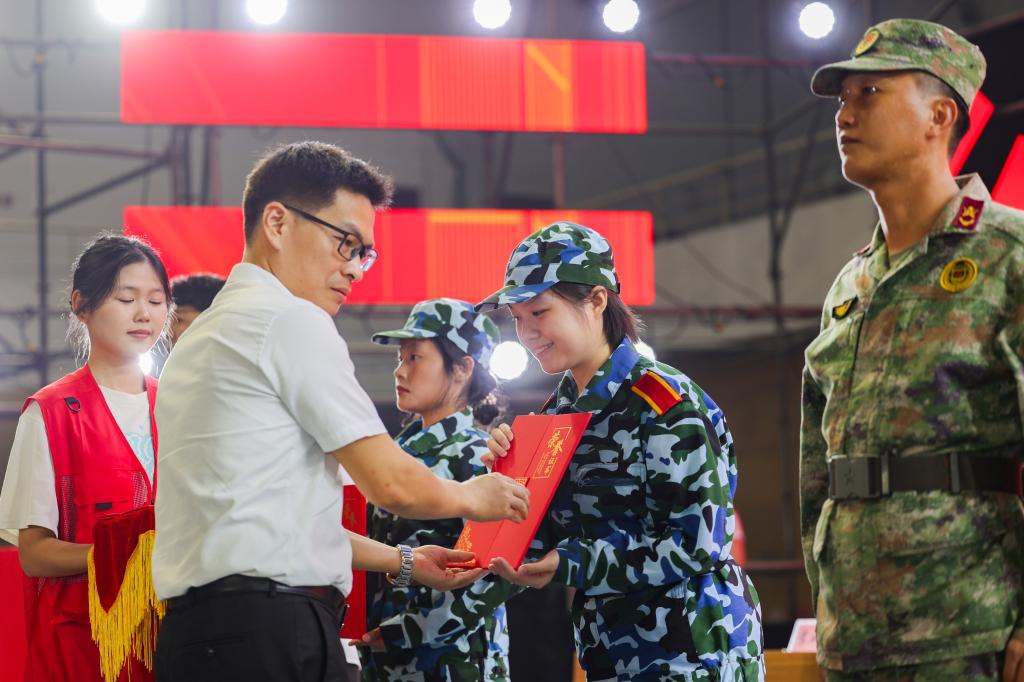 在表彰环节,杨云奇副校长宣读《关于表彰东莞职业技术学院2025级新生军训工作先进集体和先进个人的决定》。纪委书记蔡东宝为获奖集体和个人代表颁发了荣誉证书。