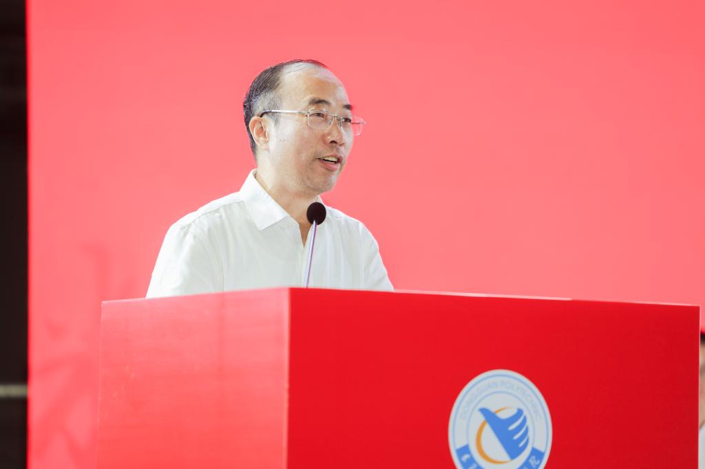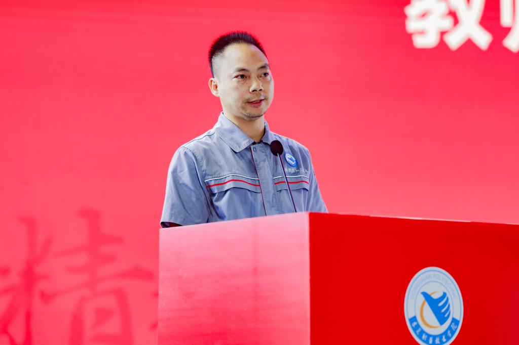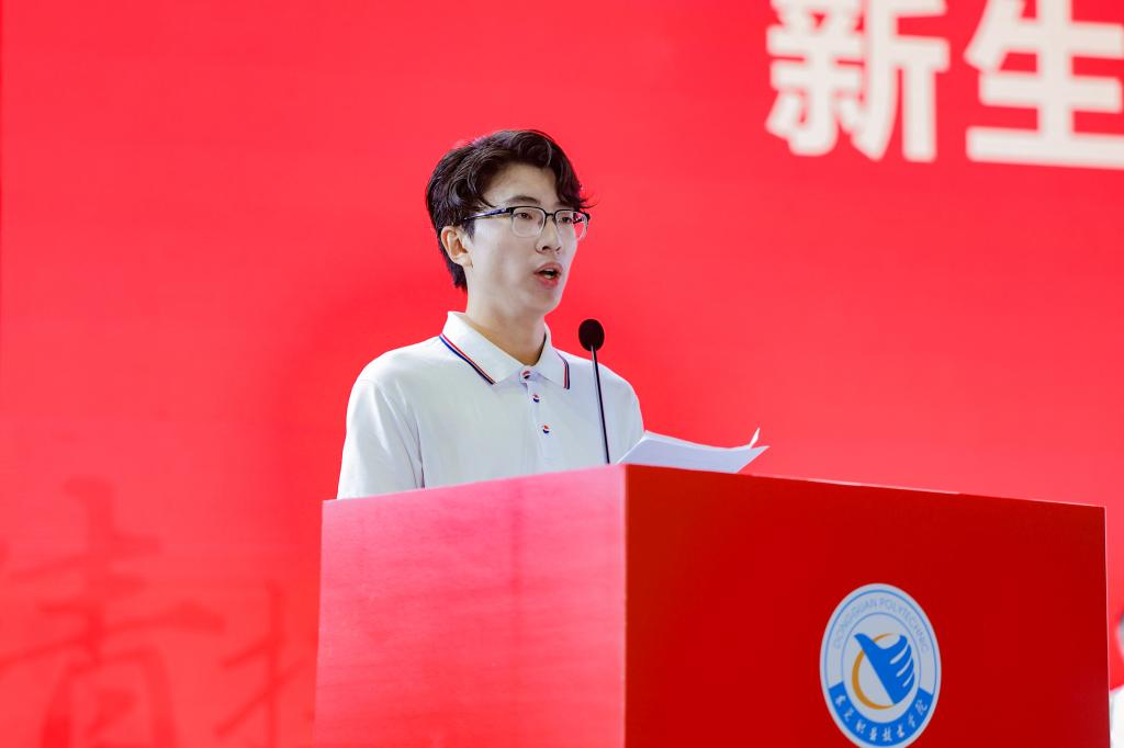 在校生代表人工智能学院钟烨和卫生健康学院新生代表廖振泽先后发言。他们共同提及“崇德、笃行、精技、创新”的校训,并表示将不负韶华、奋勇拼搏,为学校高质量发展贡献青春力量。荣获“东莞市技术能手”称号的智能制造学院李笑勉老师,作为教师代表向新生送出寄语:“要以技能成就未来,凭坚持铸就精彩”。