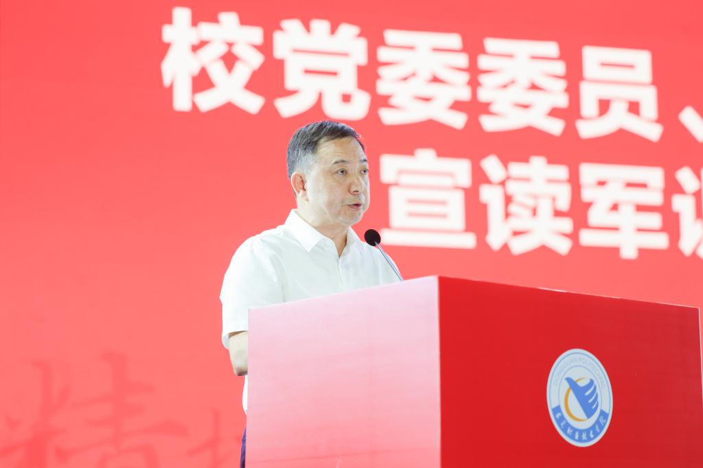 贺定修校长以《做可爱、可信、可贵、可为的新青年》为题发表讲话,他代表学校向4934名新生表示热烈欢迎,对承担军训任务的教官和老师们致以诚挚谢意,并特别为当天生日的两位同学送上暖心祝福。他指出,新时代大学生要传承抗战精神,践行校训文化,努力成长为新时代高技能人才。他强调,“在东职院,只要肯努力,人人都能出彩”,并围绕校训分享了四点感悟。一是崇德最可爱,崇德是立身处世的根本,同学们要明大德、守公德、严私德,以品德修养自我,以言行影响他人;二是笃行诚可信,知行合一,重在实践。同学们要脚踏实地,以坚实步履丈量成长之路;三是精技尤可贵。同学们需将技能锤炼至炉火纯青,沉心钻研、追求极致,以精湛技能为立身之本,成为真正的行家里手;四是创新大可为,创新是突破的核心动力。同学们要勇于尝试、不惧危险,在点滴探索中积蓄力量,终将迸发不凡光芒。